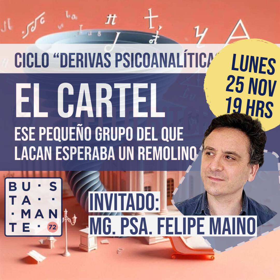 Para nuestra próxima sesión del ciclo de charlas “Derivas Psicoanalíticas”, tenemos el agrado de invitar al psicoanalista Felipe Maino Orrego. Él es miembro de la Nueva Escuela Lacaniana del Campo Freudiano (NELcf) y de la Asociación Mundial de Psicoanálisis (AMP).