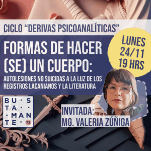 Para nuestra próxima sesión del ciclo de charlas “Derivas Psicoanalíticas”, tenemos el agrado de invitar a Valeria Zúñiga, quien es Licenciada en Literatura de la Universidad de Chile, Magíster en Psicología, Teoría y Clínica Psicoanalítica de la Universidad Diego Portales y actual estudiante de Magíster en Literatura, programa de doble